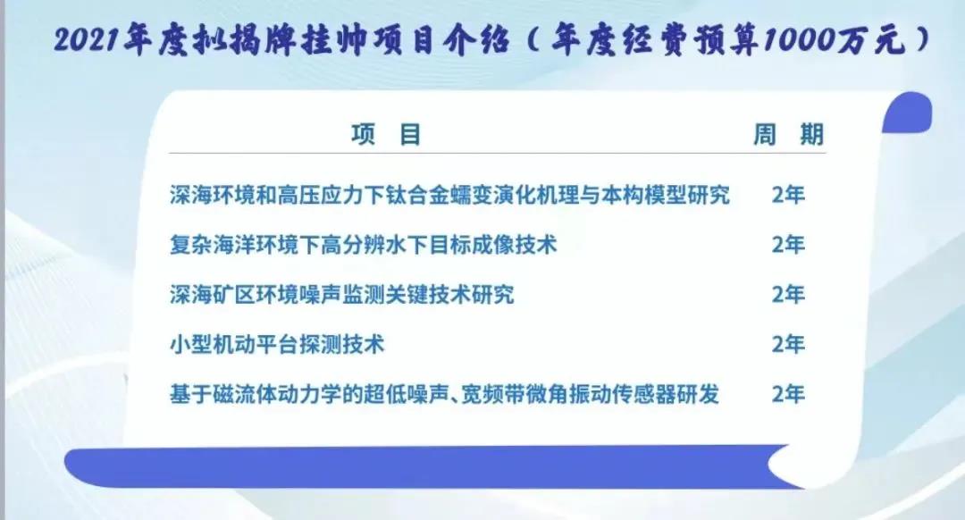 本次5個揭榜掛帥項目分別為:深海環(huán)境和高壓應(yīng)力下鈦合金蠕變演化機理與本構(gòu)模型研究、復雜海洋環(huán)境下高分辨水下目標成像技術(shù)、深海礦區(qū)環(huán)境噪聲監(jiān)測關(guān)鍵技術(shù)研究、小型機動平臺探測技術(shù)、基于磁流體動力學的超低噪聲、寬頻帶微角振動傳感器研發(fā)。