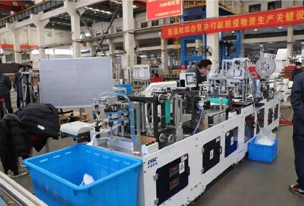 ????就在幾天前,鵬力智造已交付首批口罩機及防護服壓條機。此次交付的N95口罩機由鼻梁焊接機、打片機、耳帶焊接機三部分構成,可生產多種類型折疊口罩,單臺設備每分鐘最高生產60只口罩。