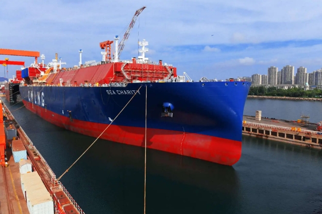 為招商輪船建造的首艘甲醇雙燃料動力智能超大型原油船103號船艉半段出塢,首次實現超大型原油船應急發電機負荷在總組階段完成調試交驗。