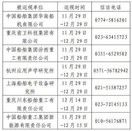 根據(jù)中國(guó)船舶集團(tuán)黨組2023年第二輪巡視工作部署,截至2023年11月29日,巡視工作已經(jīng)鋪開(kāi)。其中,對(duì)中國(guó)船舶集團(tuán)華南船機(jī)有限公司、重慶前衛(wèi)科技集團(tuán)有限公司、中國(guó)船舶集團(tuán)汾西重工有限責(zé)任公司、杭州應(yīng)用聲學(xué)研究所、上海船舶電子設(shè)備研究所等5家單位開(kāi)展常規(guī)巡視,對(duì)重慶川東船舶重工有限責(zé)任公司、中國(guó)船舶重工集團(tuán)新能源有限責(zé)任公司等2家單位開(kāi)展專項(xiàng)巡視。